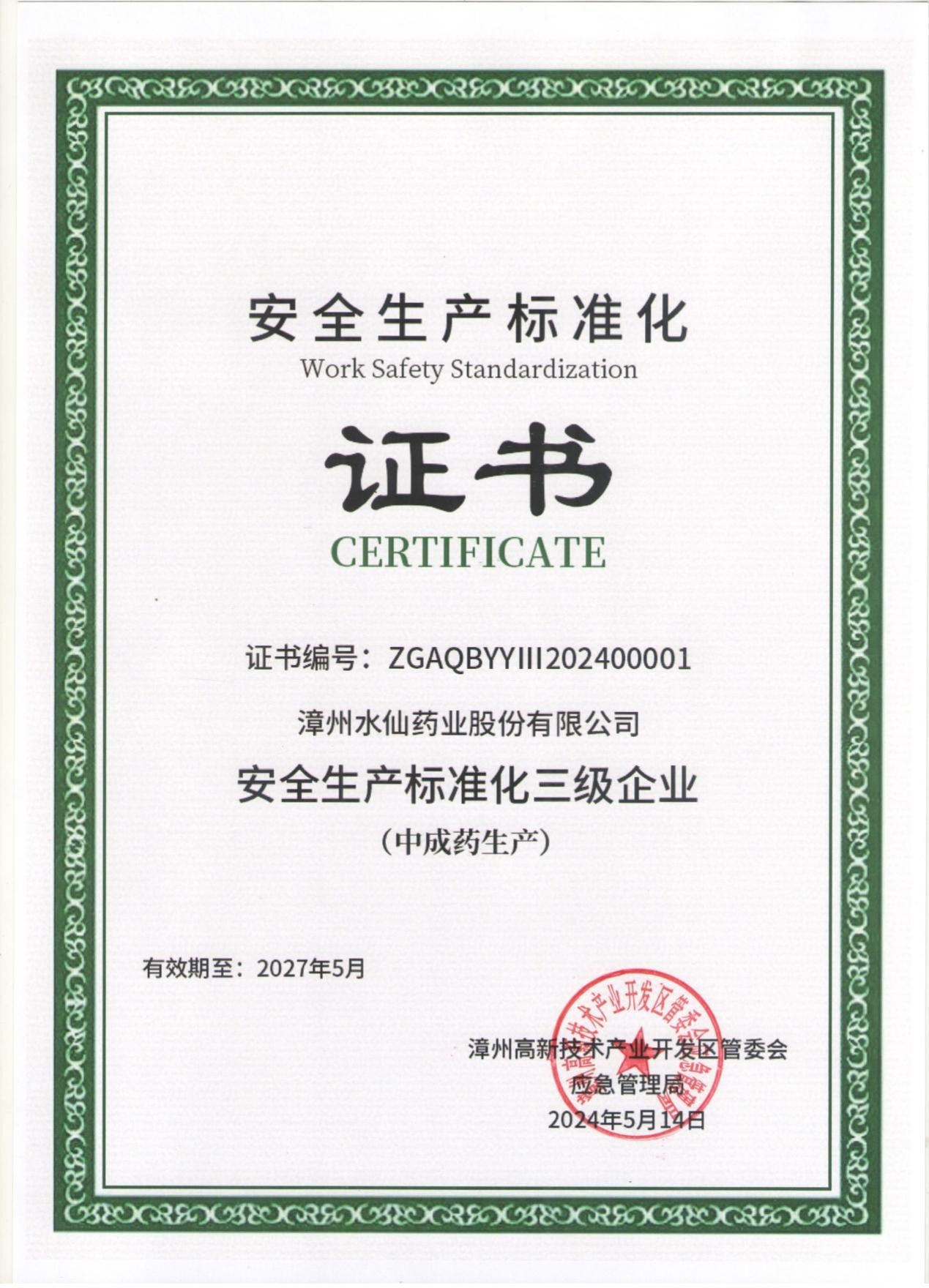 漳州水仙成功取得“安全生產(chǎn)標(biāo)準(zhǔn)化三級企業(yè)證書”