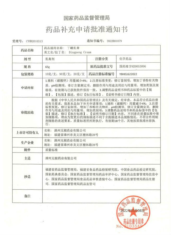 2018年9月無極公司啟動(dòng)丁硼乳膏質(zhì)量提升工作,在技術(shù)中心、質(zhì)量管理部、生產(chǎn)部等部門與北京CRO公司的通力協(xié)作下,歷時(shí)3年多,經(jīng)過實(shí)驗(yàn)室小試、中試、商業(yè)批次放大生產(chǎn)以及產(chǎn)品的穩(wěn)定性考察、資料申報(bào)各個(gè)環(huán)節(jié),無極公司于2022年3月8日收到國(guó)家藥品監(jiān)督管理局藥品補(bǔ)充申請(qǐng)批準(zhǔn)通知書,丁硼乳膏質(zhì)量提升補(bǔ)充申請(qǐng)正式獲得國(guó)家藥監(jiān)局批準(zhǔn)。